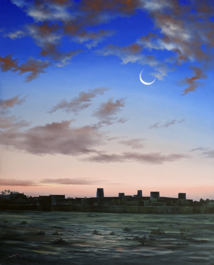 This painting, inspired by old photographs of Riyadh from the early part of the Twentieth Century, shows Riyadh as it would have looked in the past with the city wall and the desert beyond. The towers of the Musmak Fort can be seen above the roofline of the surrounding  buildings.