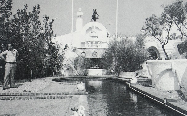 Garden and swimming pool at Dali's house (note the builders’ skip doubling up as a fountain in the centre!)