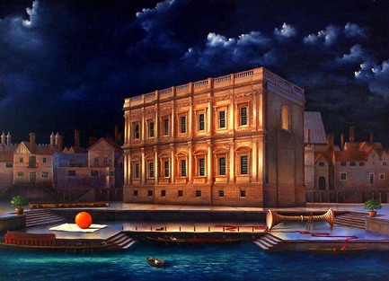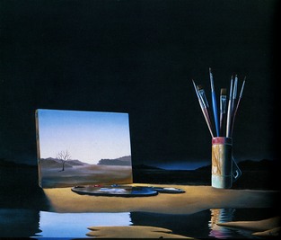 Bouchard loves classical architecture and performing magic tricks, both on and off the canvas, and it is the fusion of the two which pervades many of his pictures. He is happy with familiar objects which are both solid and visually comfortable. He then places these objects, be they chess squares or playing cards, in a dream setting. He weaves a fantasy out of recognisable landscapes. It is the world of his imagination, but if we are happy with the objects he has taken to his desert island we are welcome to join him.